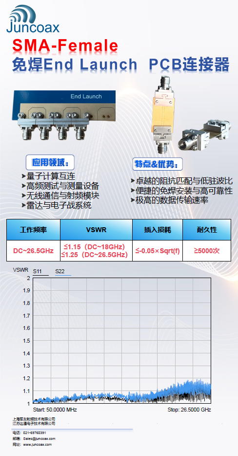 SMA-Female免焊End Launch PCB连接器凭借卓越的阻抗匹配与低驻波比特性,成为高频应用的理想选择。其便捷的免焊安装方式兼顾了高可靠性,支持极高的数据传输速率。这些优势使其在量子计算互连、高频测试设备、无线通信射频模块以及雷达与电子战系统等前沿领域发挥着关键作用,保障了信号的完整性与系统性能。